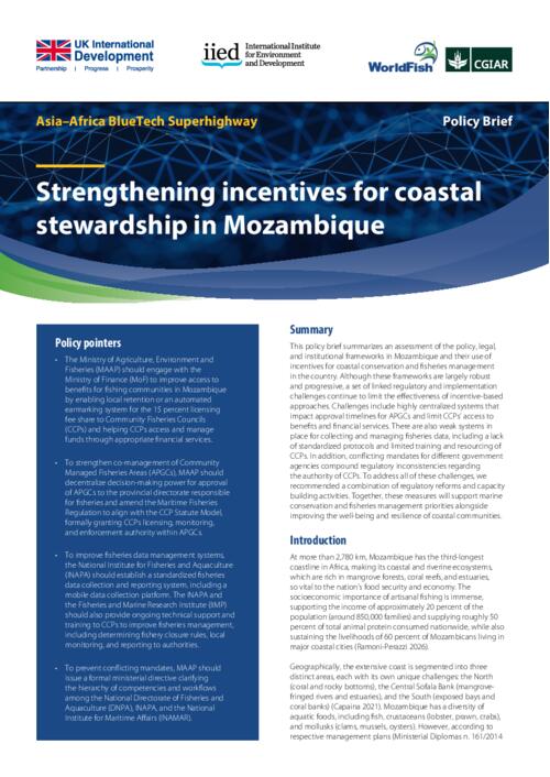 Castiano M and Lopes S. 2026. Strengthening incentives for coastal stewardship in Mozambique. Penang, Malaysia. WorldFish and IIED. Policy Brief: 2026-09.