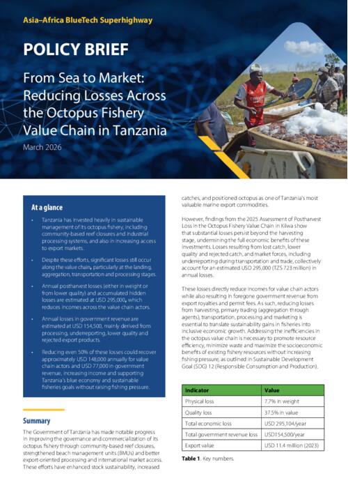 Mwijage AP, Gabagambi NP, Luomba JO, Kuboja BN, Mwakiluma YW, Mwaka IJ, Ngwenyama P, Luvanga SA, Mkuchu J, Kishe M, Ward A, Mgawe Y, Kimirei IA and Parmar A. 2026. From Sea to Market: Reducing Losses Across the Octopus Fishery Value Chain in Tanzania. Penang, Malaysia. WorldFish. Policy Brief: 2026-16.